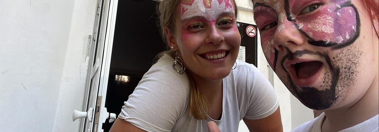Na de lunch zijn we met de kinderen gaan schminken. Iedereen was aan de beurt en zelfs de jongens moesten eraan geloven. Van piraten tot aan vlinders; alles kwam aan bod. Ook hadden we glittertattoos die de kinderen geweldig vonden. Het eindresultaat mocht er zeker wezen, want iedereen had veel plezier. Elk kind of groepsgenoot had een lekker kleurtje/tekening op zijn of haar gezicht.